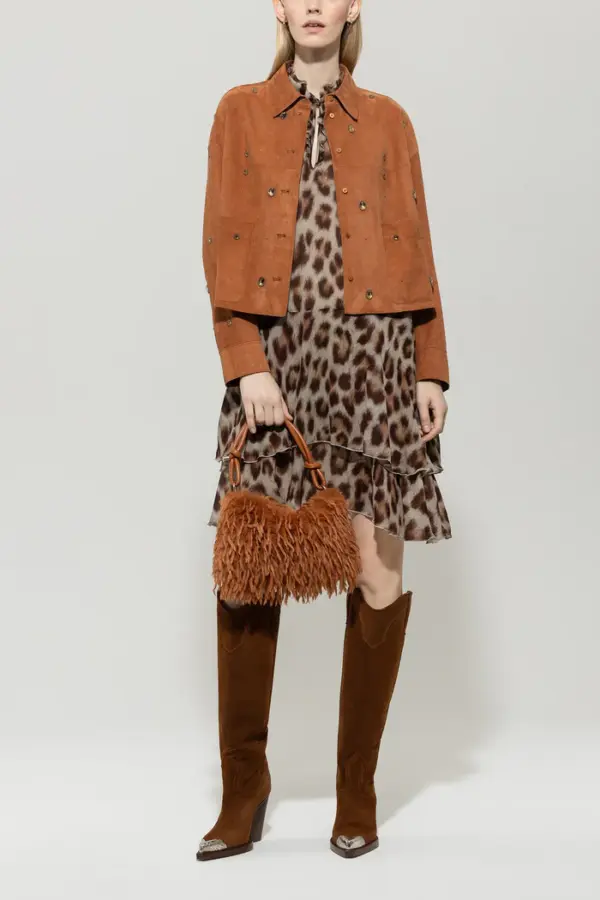 Krótka kurtka Luisa Cerano koszulowa wykonana z luksusowego, miękkiego jak rękawiczka koziego zamszu z zapięciem na guziki i rozciętymi kieszeniami. Naszywane elementy dekoracyjne wykonane z błyszczących kamieni i metalowych koralików dopełniają elegancki design.