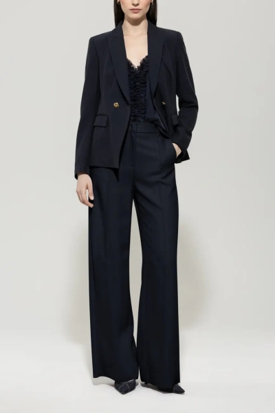 Spodnie z cholewką z lejącego triacetatu o matowym satynowym wykończeniu i z zakładkami. Dwie kieszenie boczne i dwie imitacje kieszeni z tyłu dopełniają całości.