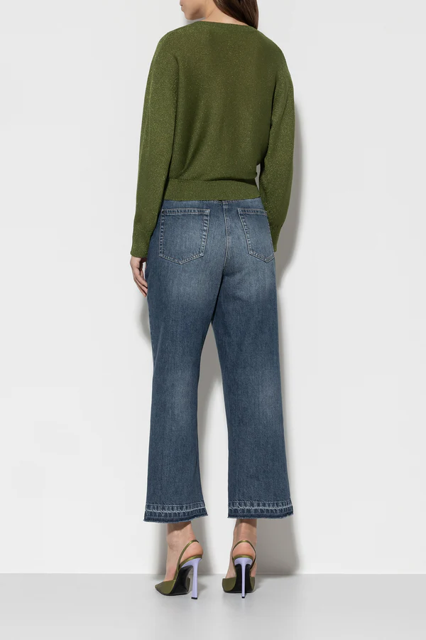 Dżinsy o luźnym kroju wykonane z autentycznego elastycznego denimu w stylu vintage z pięcioma kieszeniami. Nogawki są rozszerzane i mają otwarty, postrzępiony brzeg. Wywinięta talia i efekt zniszczenia dopełniają modny design.