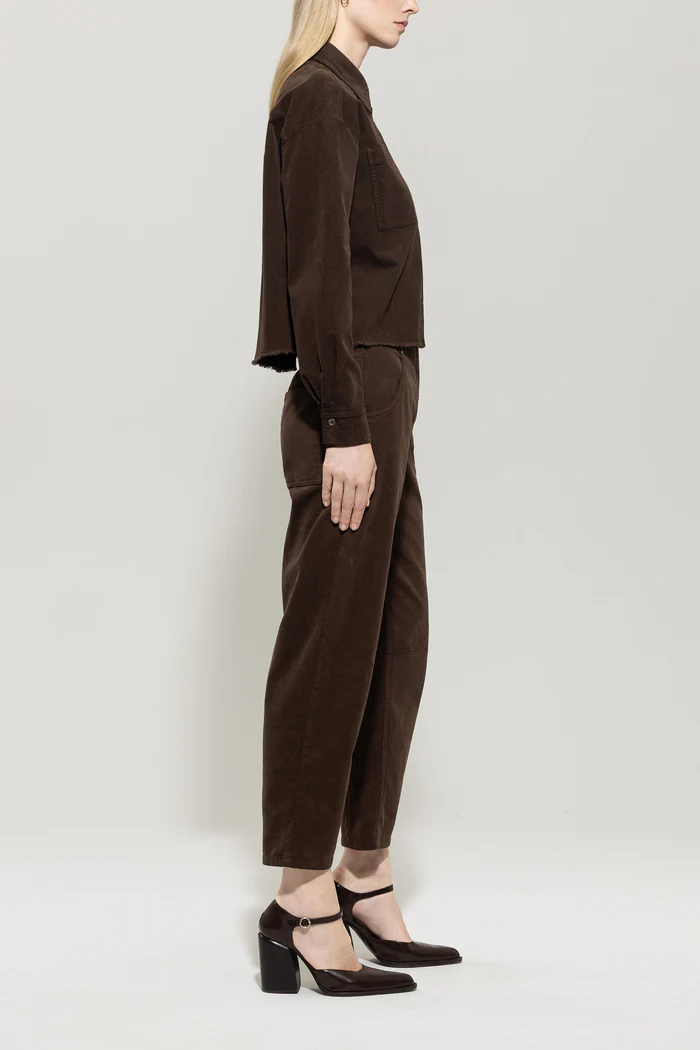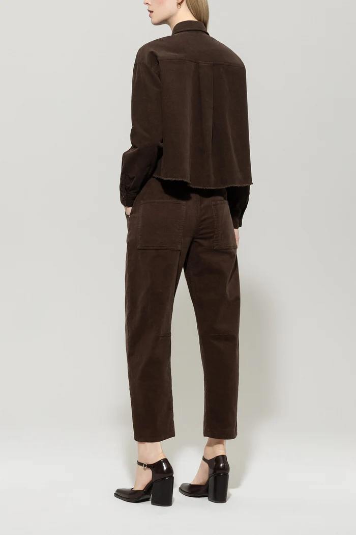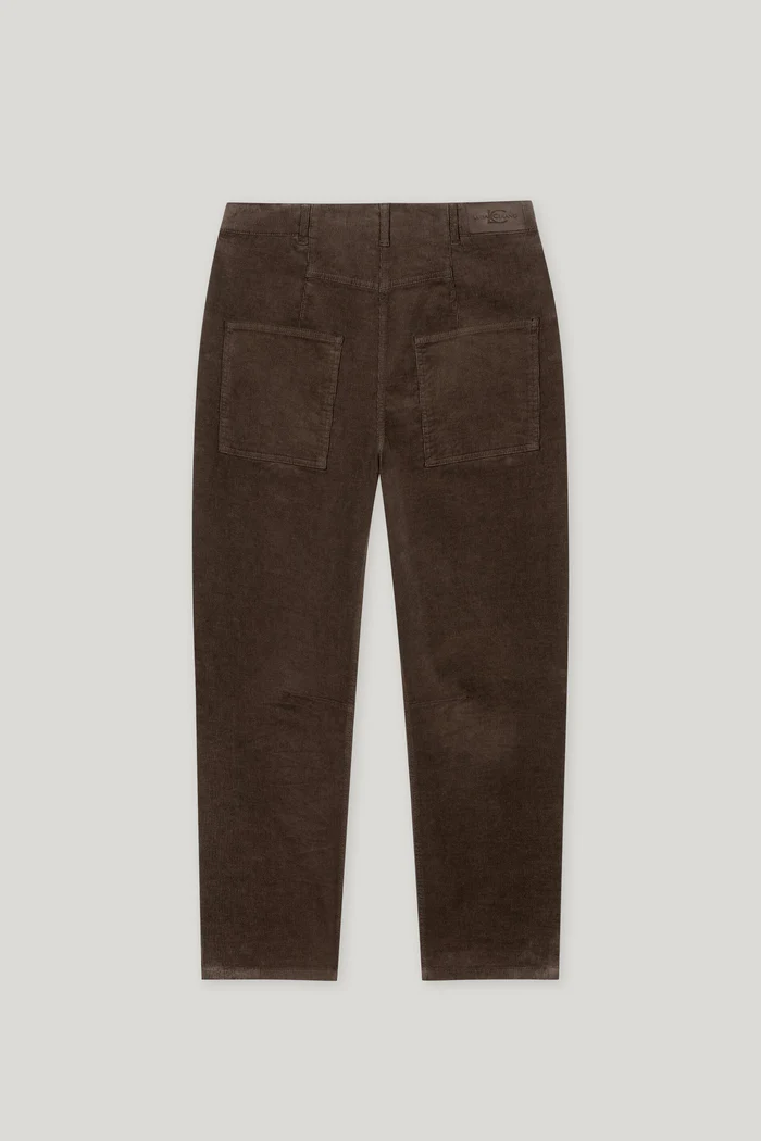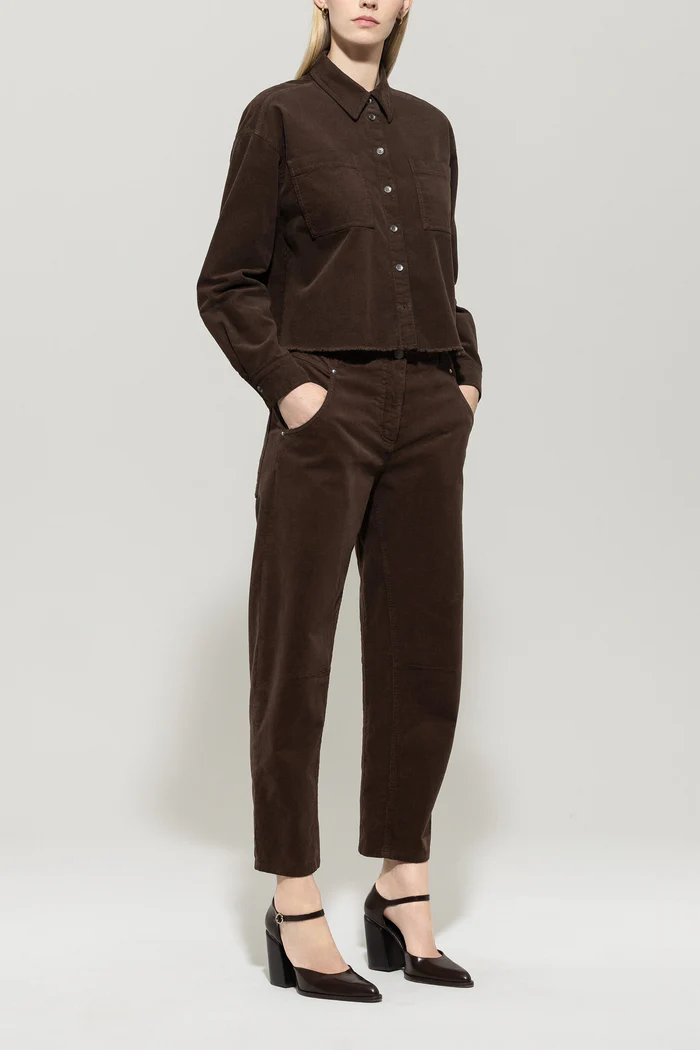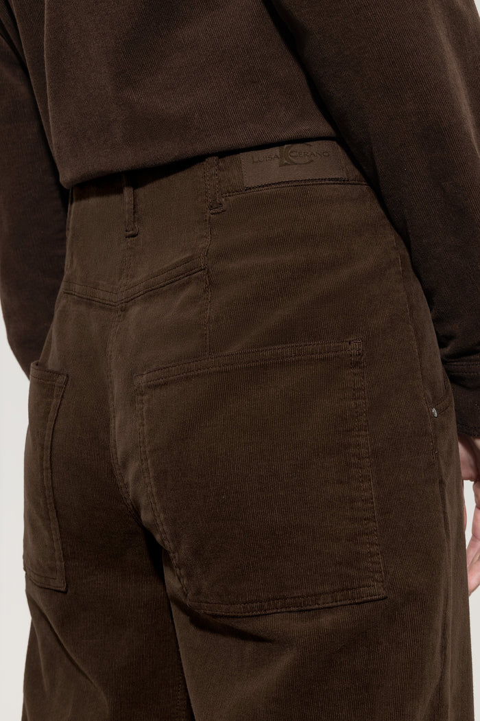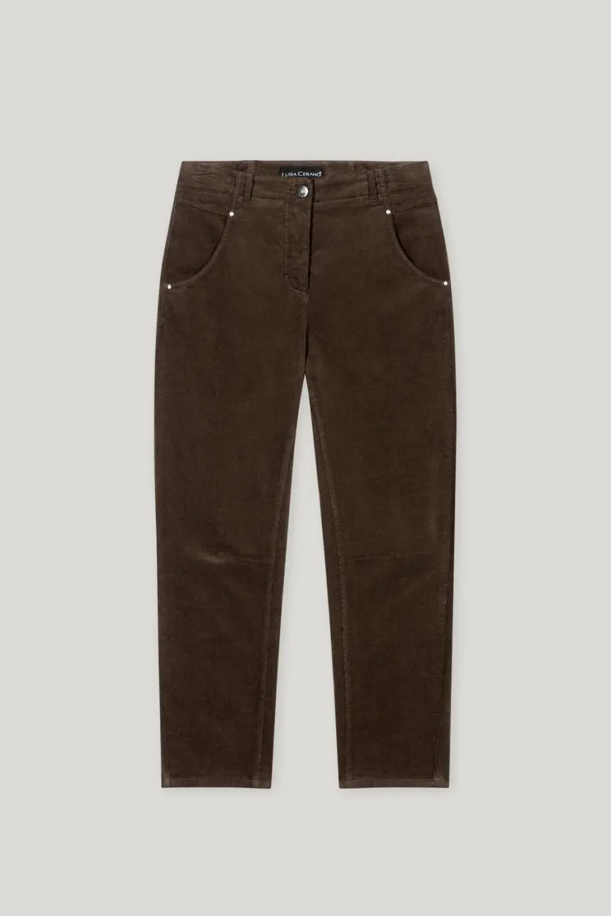 Sztruksowe spodnie Luisa Cerano z zakrzywioną nogawką, czterema kieszeniami i ćwiekami. W kolanach znajduje się zaszewka.