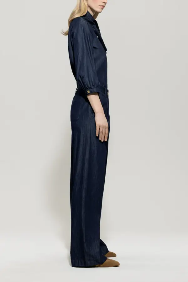 Lekkie, sprane dżinsy z wyjątkowo miękkiej bawełny z wyraźną szeroką nogawką. Plisy podkreślają swobodny krój.  Pas ze szlufkami. Zapięcie na guzik i zamek błyskawiczny. Dwie rozcięte kieszenie i dwie kieszenie z tyłu.