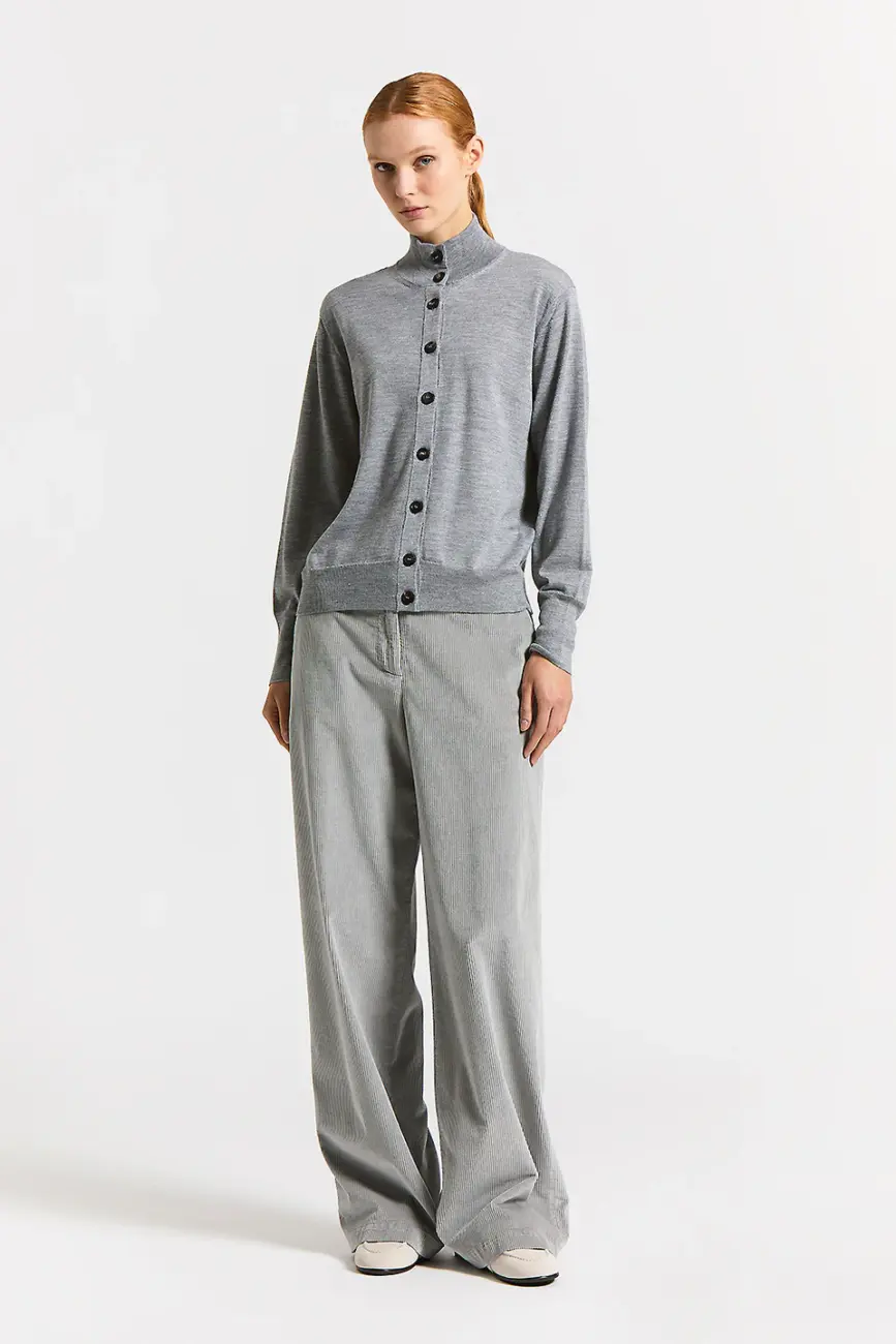 Kardigan z wysokim kołnierzem, wykonany z lekkiej i ciepłej przędzy z dziewiczej wełny i wiskozy, zapinany jest na guziki i idealnie nadaje się do noszenia na pasującym golfie lub na bluzkach i koszulach. Ponadczasowo elegancki element garderoby, dzięki połączeniu cienkiej przędzy z lekkim lureksem, który dodaje swetrowi subtelnego połysku.