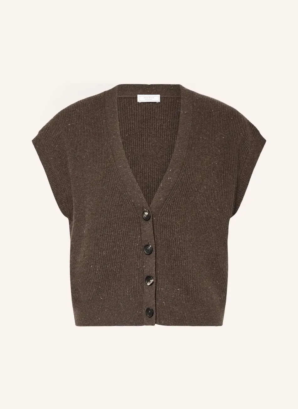 Lekko skrócony kardigan w kolorze hebanowego brązu jest dziergany ściegiem rybackim, z cienkiej wełny, jedwabiu i kaszmiru, z dodatkiem lureksu. Z szerokim dekoltem w serek i bez rękawów, można go uznać za kamizelkę, idealną do noszenia na białej koszuli lub bluzce, w połączeniu ze spódnicami lub spodniami w sezonowych kolorach.
